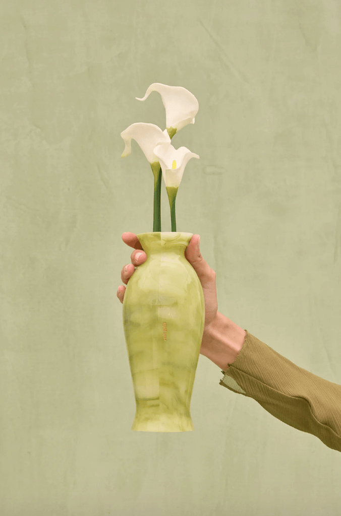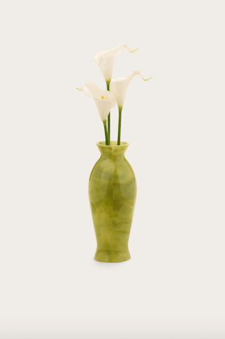 A marbled acrylic vase of calla lilies that opens for storage and functions as wearable art. Handmade with love, each Calla flower is unique.