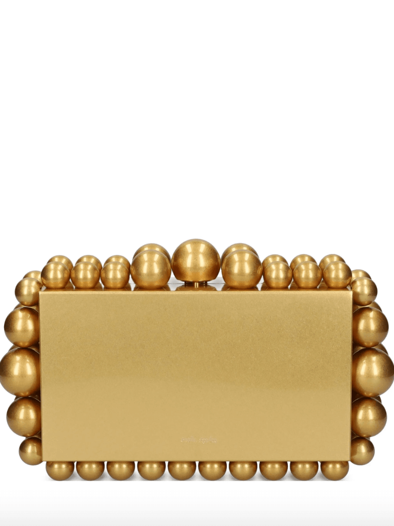 The signature acrylic box shaped clutch with coordinating beads surrounding the edges now in our antique brass.