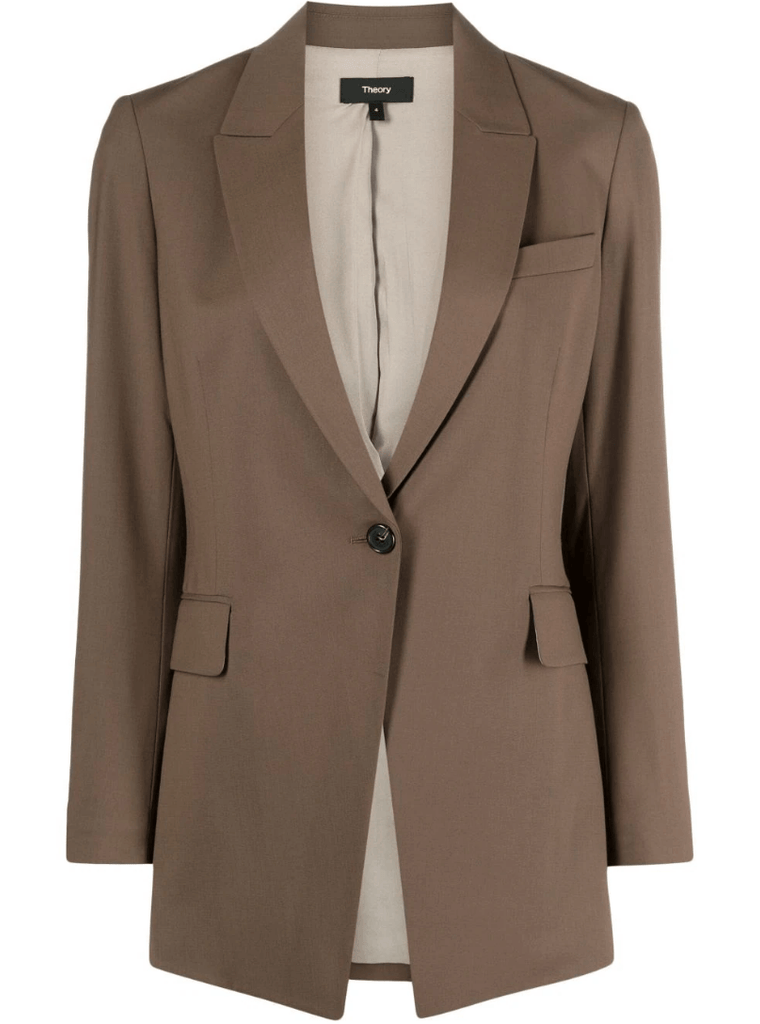 Theory's reputation for timeless wardrobe staples is reinforced with this blazer. It’s precision tailored to a slim silhouette from wool with a hint of stretch and washed in an understated neutral brown hue,