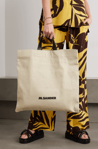 This Jil Sander tote bag supports the brand's reputation for using premium fabrications in a minimalist aesthetic. Crafted in Italy from a mix of calico canvas and smooth calf leather, the piece accentuates the branding in a bold logo print to the front.