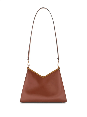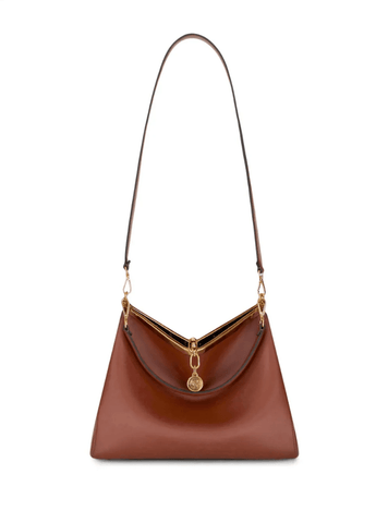 Medium leather Vela shoulder bag from the Spring-Summer 2023 Fashion Show collection and featuring a metal fastening with chain embellished by a medallion with ETRO logo and Pegaso. Inside, the bag contains a leather pouch.